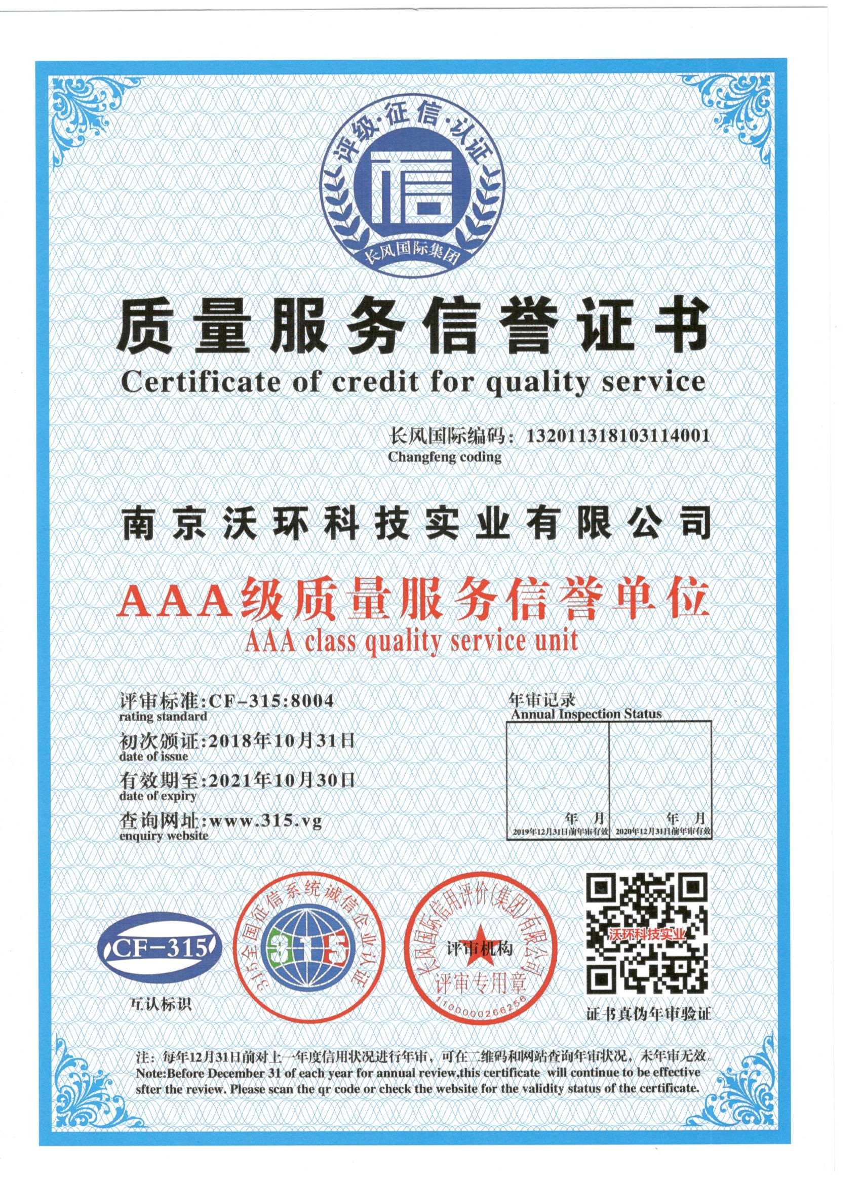 熱烈祝賀南京沃環(huán)公司被專業(yè)評審機構(gòu)-長風國際集團評為AAA級質(zhì)量服務(wù)信譽,特發(fā)此證書